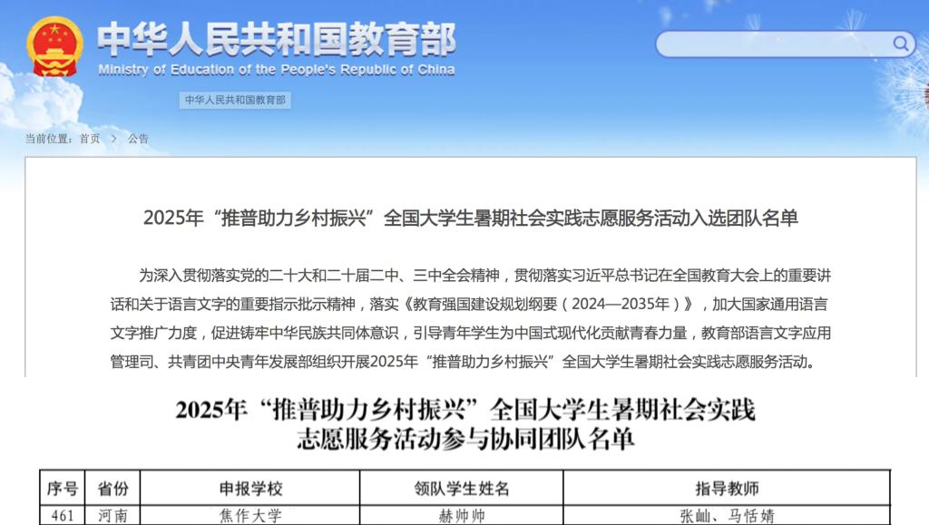 7月3日,教育部发布了《2025年“推普助力乡村振兴”全国大学生暑期社会实践志愿服务活动入选团队名单》,我校申报的“聚焦青春·共振村声”推普团队成功入选。